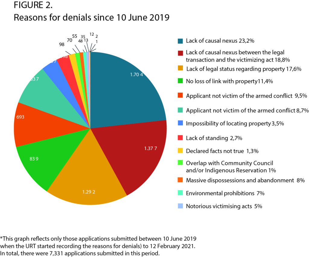 Furthermore, one of the most egregious problems present in the implementation of the land restitution policy is the mass rejection of thousands of applications by the URT during the initial stage of the process. Specifically, 65% (59,969) of applications with a final decision have been denied inclusion in the Land Registry, thereby terminating the process for these applicants. Despite the fact that the majority of applications have been rejected by the URT, there is little public information that helps explain these abysmal results or records the reasons the decisions were taken. In fact, the URT did not keep a record for the reasons it denied land restitution applications until June 2019, eight years after the process began.